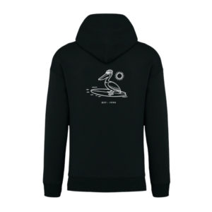 With its minimalist design and cool vibe, this black hoodie features a relaxed pelican, wearing a beanie, gliding on its surfboard under a stylized sun. A nod to the Surfrider spirit: original, timeless, and always ready to hit the water.