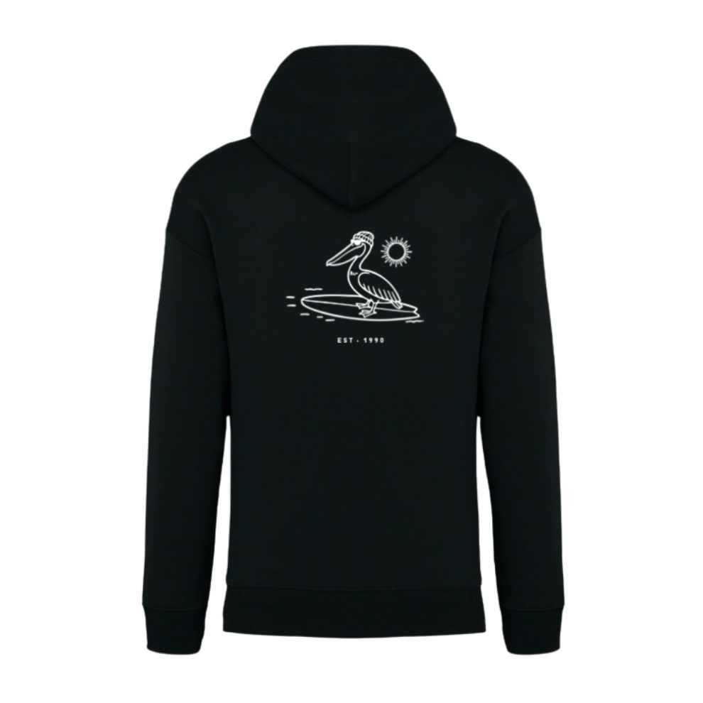 🌊 Back graphic: clean white illustration of a pelican on a surfboard, under a sun, with the inscription ‘EST. 1990’.